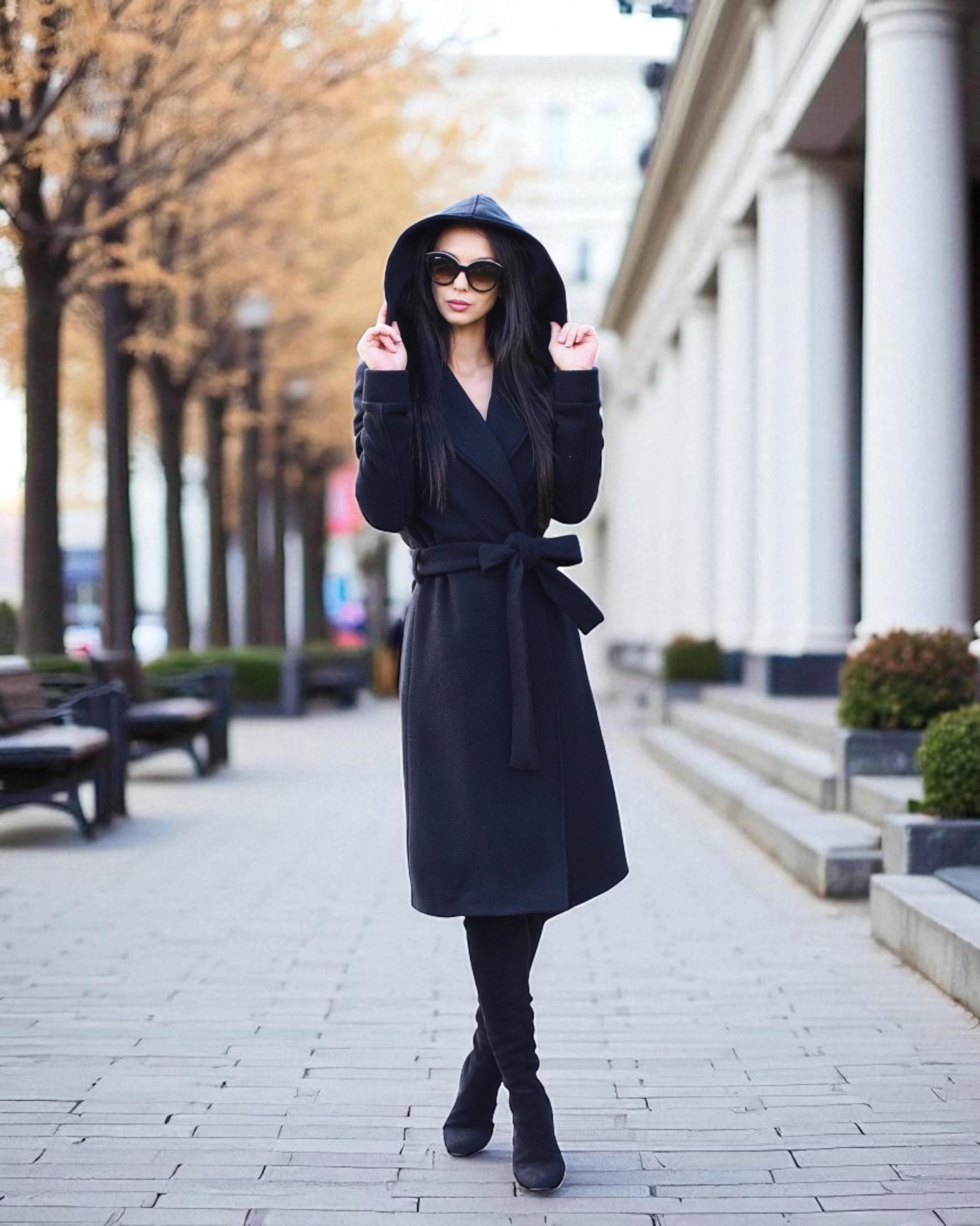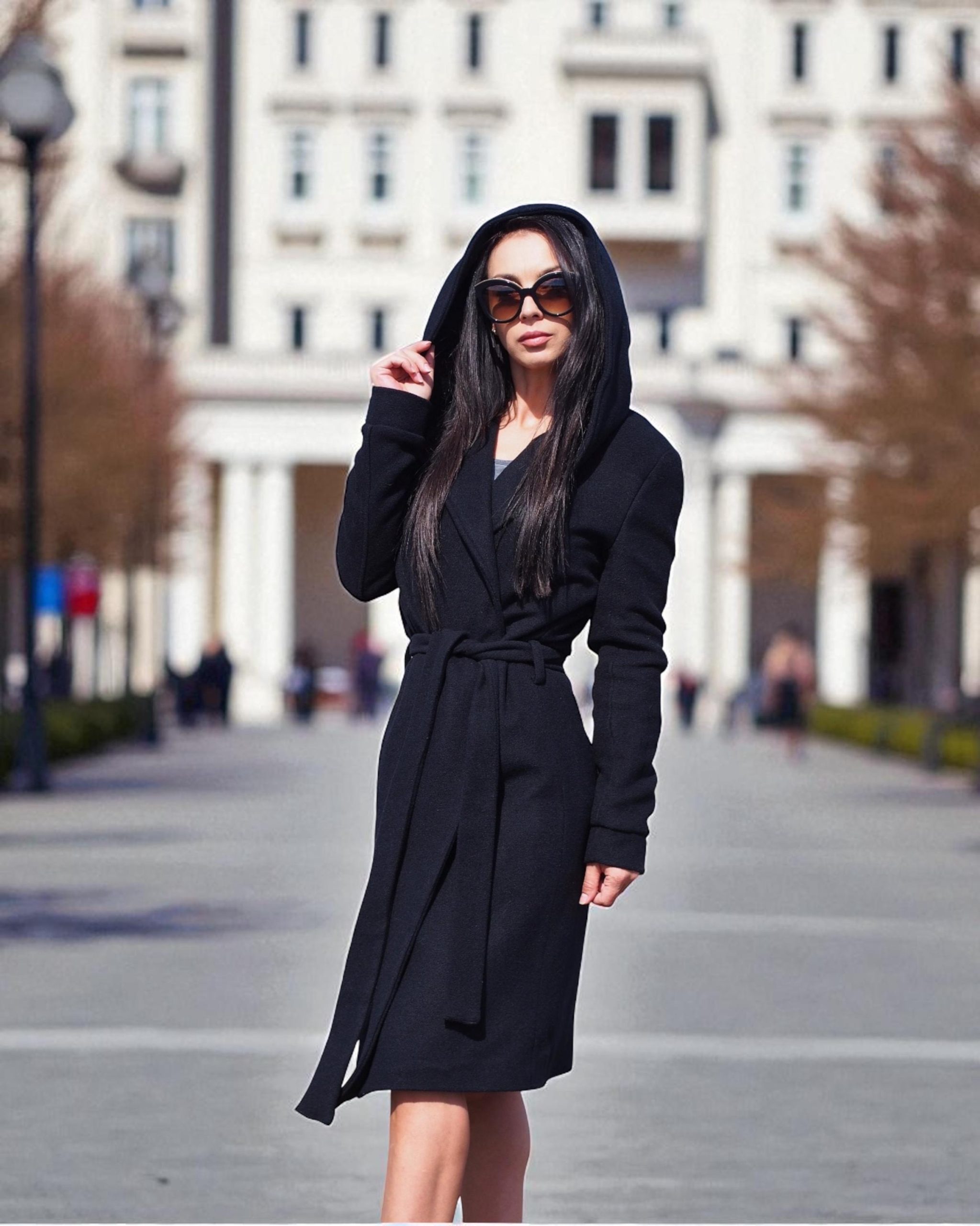 Long Cashmere Coat Wool Women Black Hooded Maxi