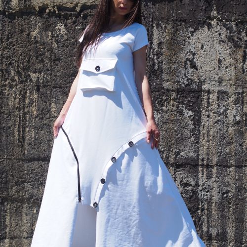 Step into effortless elegance with this unique white maxi dress, crafted from breathable cotton fabric. This contemporary piece features a flattering A-line silhouette, a front statement pocket with a button, and asymmetrical decorative buttons that add an artistic touch to the hemline. Comfortable yet bold, it s perfect for summer days, art events, casual strolls, or a standout vacation outfit.